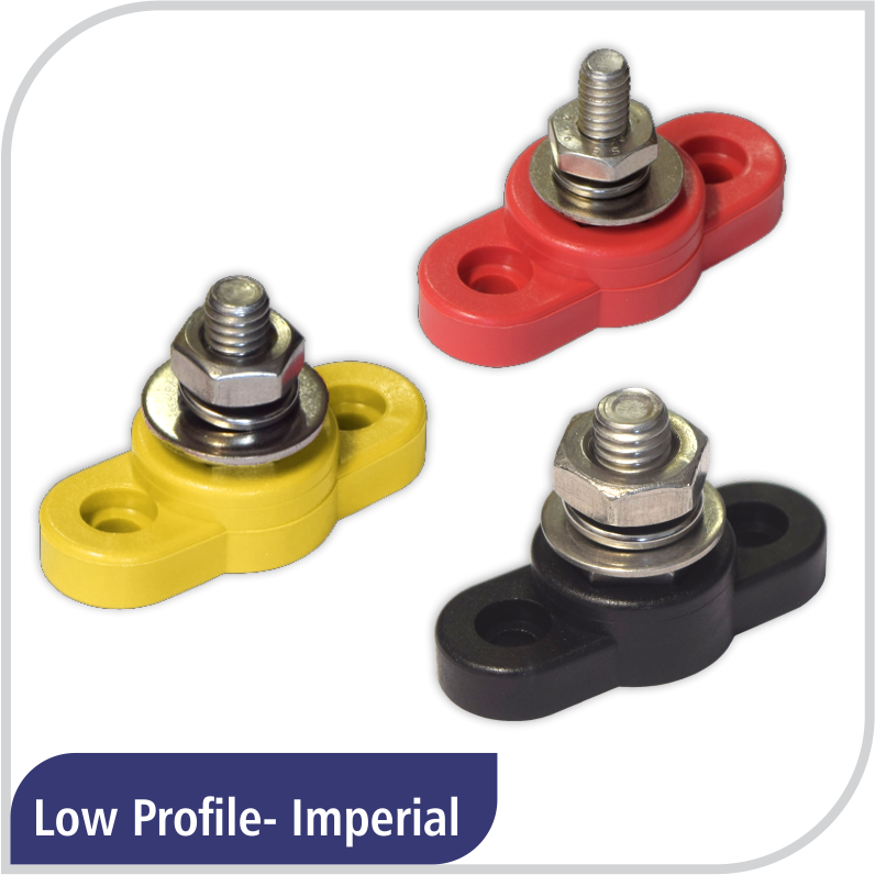 1 Point Low Profile – Imperial: Our new low profile single point power posts can be used to connect power lines or consolidate ground lines in tight areas where space is at a premium. Available in metric & imperial sizes.