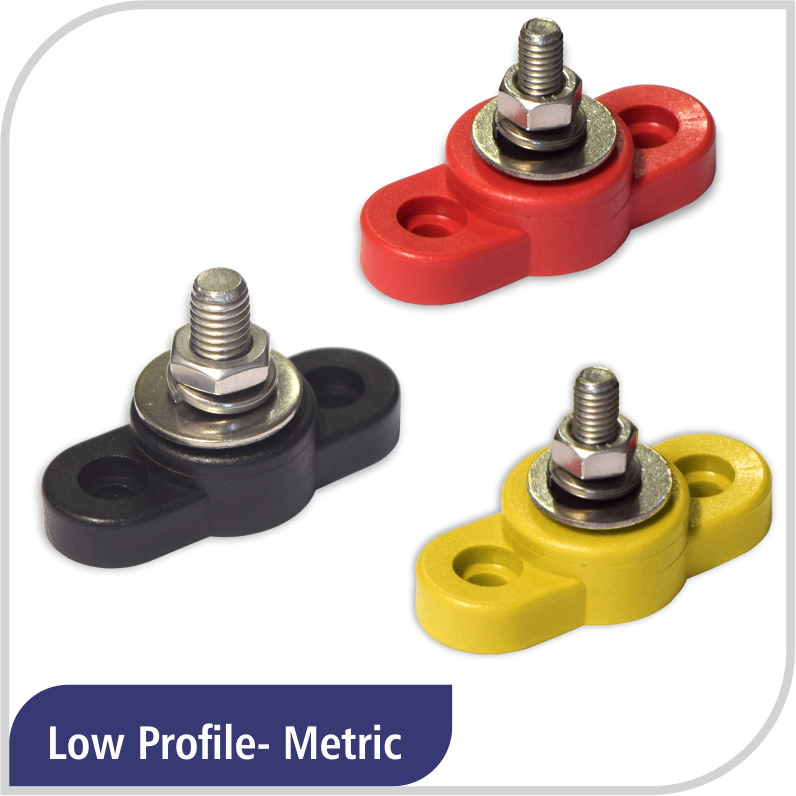 1 Point Low Profile – Metric: Our new low profile single point power posts can be used to connect power lines or consolidate ground lines in tight areas where space is at a premium. Available in metric & imperial sizes.