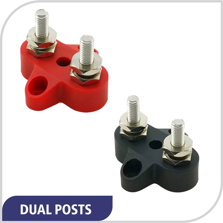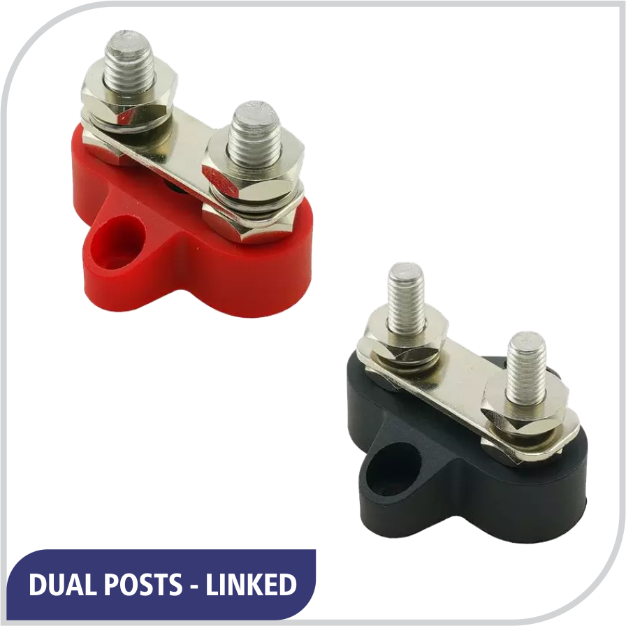 Dual Posts Linked: Our Small Base Dual Linked Power Posts are compact in design and ideal for creating a centralised power distribution or grounding point.